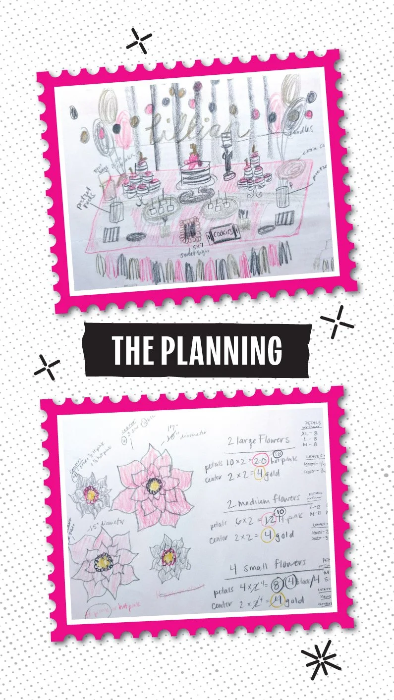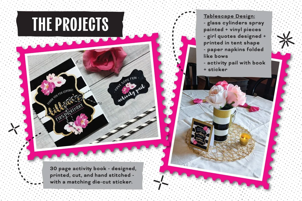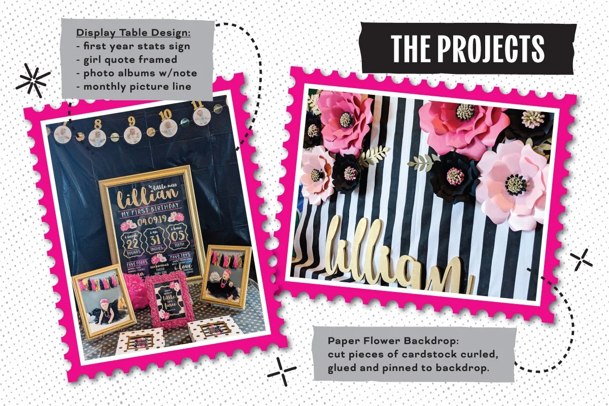 And because I am, at my core, a planner (and proud of it), I created full illustration diagrams—yes, plural—both detailed and in full color to map everything out. The projects were meticulously thought out and crafted by hand. The tablescape had spray-painted vases wrapped in thick vinyl stripes with big pink blooms, little table tents featuring girl quotes, and fuchsia napkins folded into bows (because regular folds were not an option). Each table also had an activity pail, complete with colored pencils and copies of a 30-page activity book that I designed, printed, cut, and hand-bound—plus a matching die-cut sticker, of course. The dessert table? A labor of love. Large paper flowers made from what felt like a million pieces of cardstock, all layered, curled, and glued onto a striped backdrop, paired with themed signs, cupcake toppers, chocolate-dipped pretzels, and beautifully decorated cookies. The feature table included framed signs with her first-year stats and a sweet quote, a clothesline of die-cut monthly photos, and photo albums with little themed notes. And to tie it all together, I designed her one year photoshoot backdrop that created an adorable focal point for her invitations and thank-you cards—because once I start, I simply cannot stop. The best part—seeing every detail come together on the day of the party, making all of the hot glue burns and paper cuts worth it.