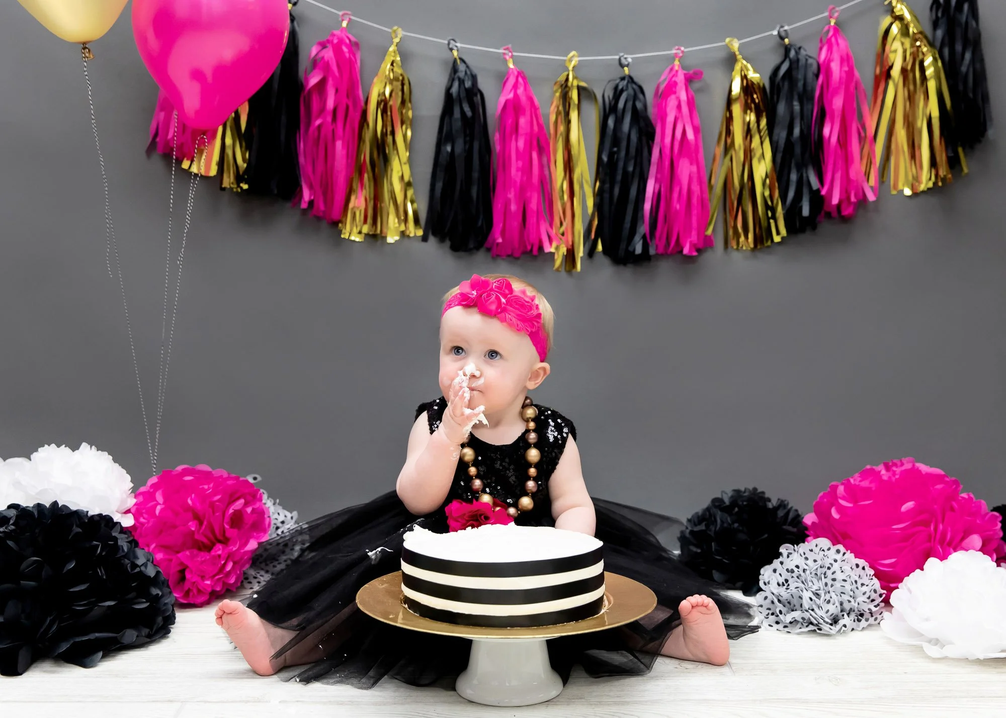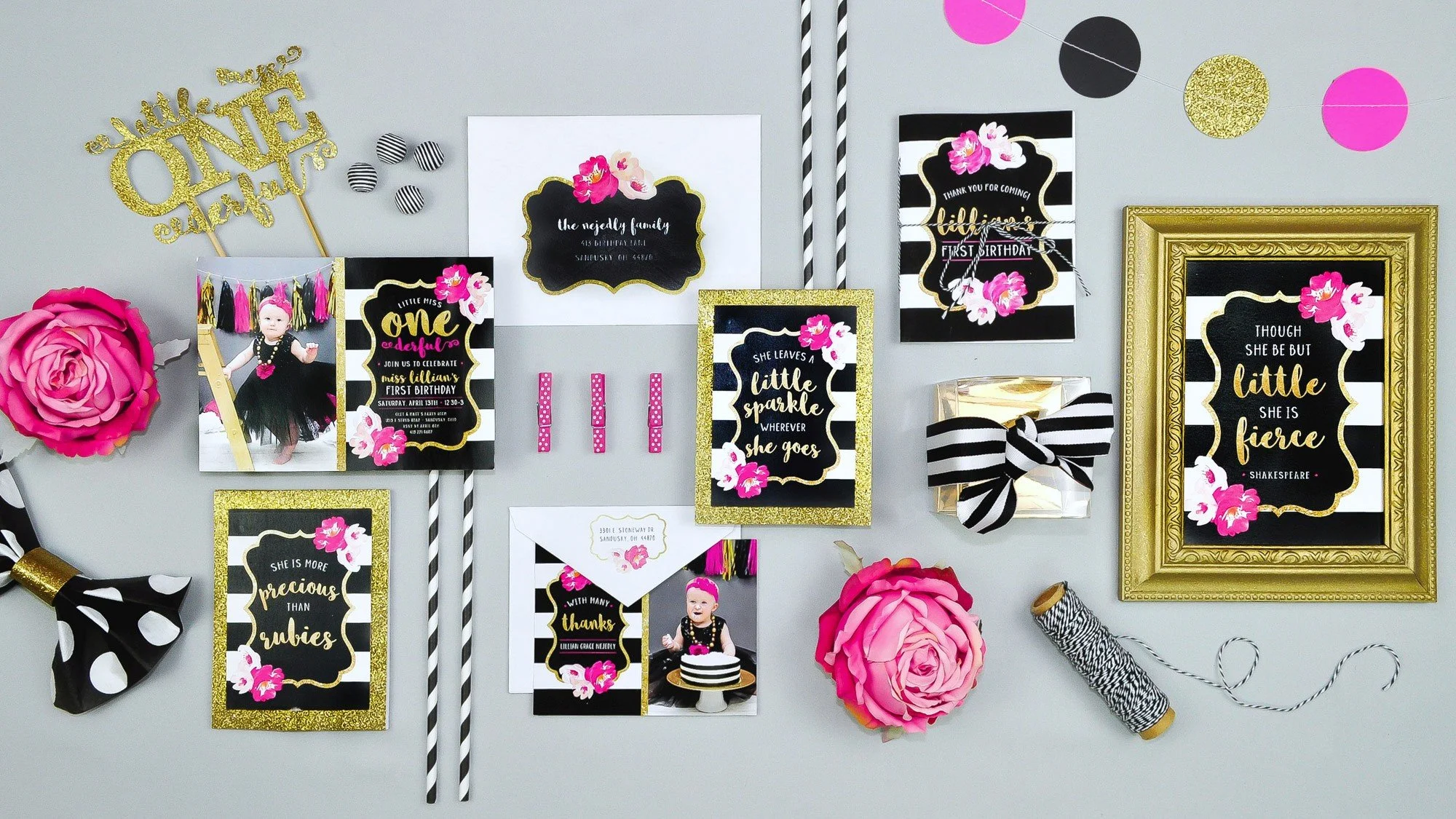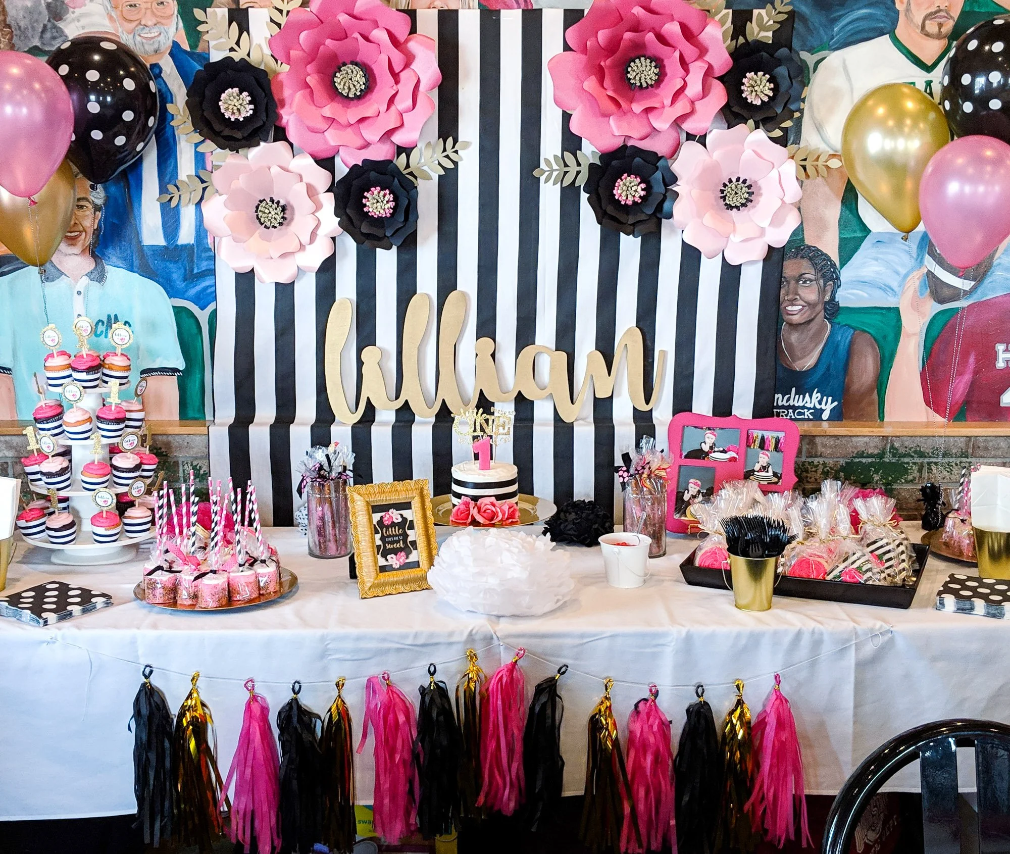 And because I am, at my core, a planner (and proud of it), I created full illustration diagrams—yes, plural—both detailed and in full color to map everything out. The projects were meticulously thought out and crafted by hand. The tablescape had spray-painted vases wrapped in thick vinyl stripes with big pink blooms, little table tents featuring girl quotes, and fuchsia napkins folded into bows (because regular folds were not an option). Each table also had an activity pail, complete with colored pencils and copies of a 30-page activity book that I designed, printed, cut, and hand-bound—plus a matching die-cut sticker, of course. The dessert table? A labor of love. Large paper flowers made from what felt like a million pieces of cardstock, all layered, curled, and glued onto a striped backdrop, paired with themed signs, cupcake toppers, chocolate-dipped pretzels, and beautifully decorated cookies. The feature table included framed signs with her first-year stats and a sweet quote, a clothesline of die-cut monthly photos, and photo albums with little themed notes. And to tie it all together, I designed her one year photoshoot backdrop that created an adorable focal point for her invitations and thank-you cards—because once I start, I simply cannot stop. The best part—seeing every detail come together on the day of the party, making all of the hot glue burns and paper cuts worth it.